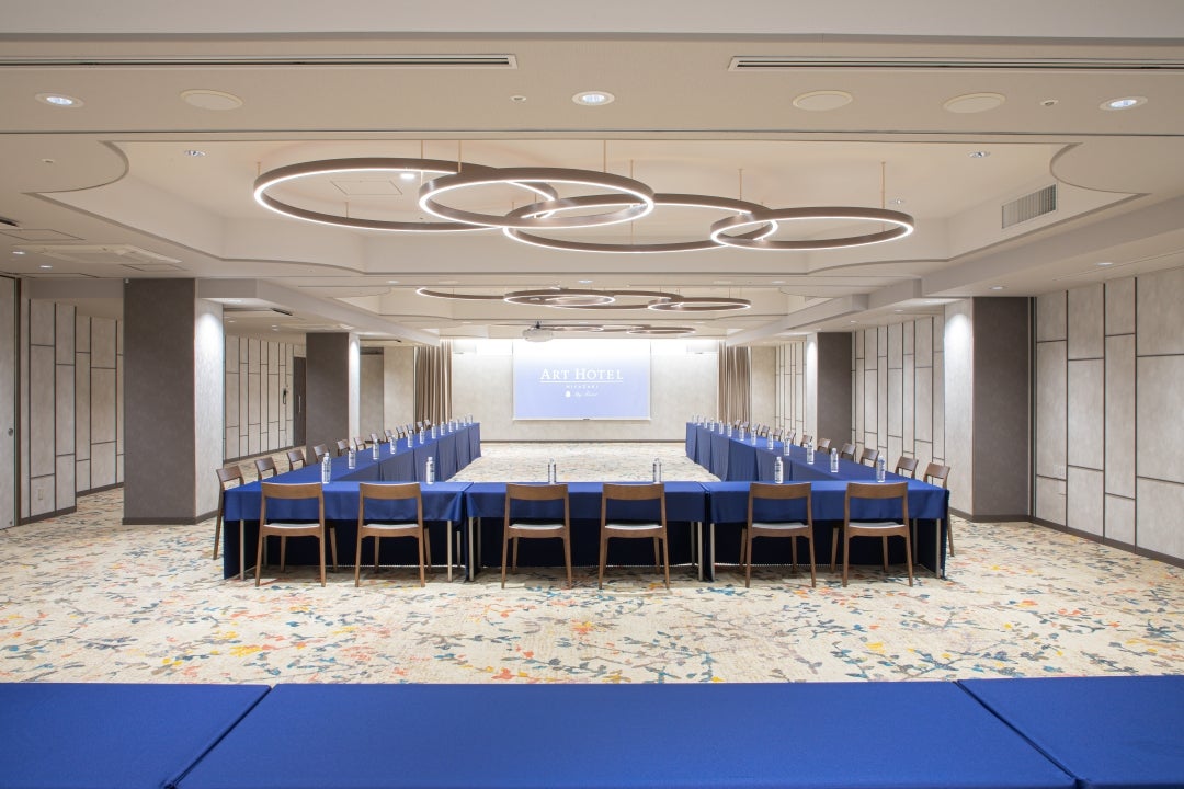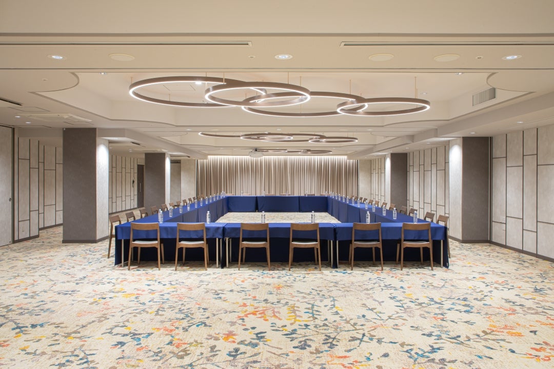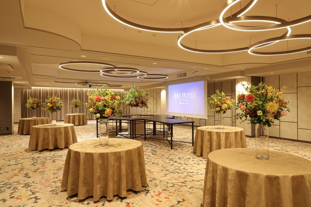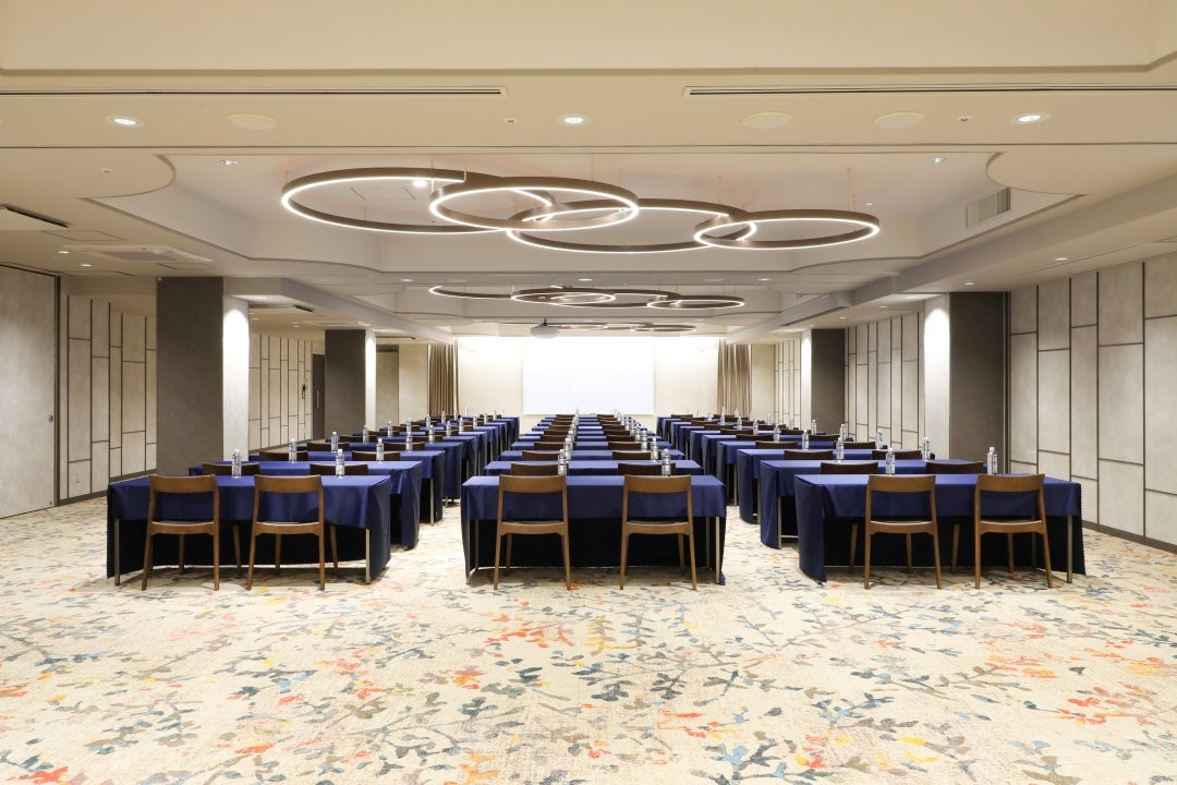 最大223名収容の大会場「日向」(ひなた)は、 人と人の出会いや広がっていく繋がりを宮崎のあたたかな風になびく枝葉で表現しました。 各種宴会、会議などのシーンに合わせ照明の調光調色が可能でございます。 可動式の仕切りを設けており、向日葵(ひまわり)最大収容96名、菜ノ花(なのか)最大収容42名、 立葵(たちあおい)最大収容72名の3会場に分割しご利用いただけます。