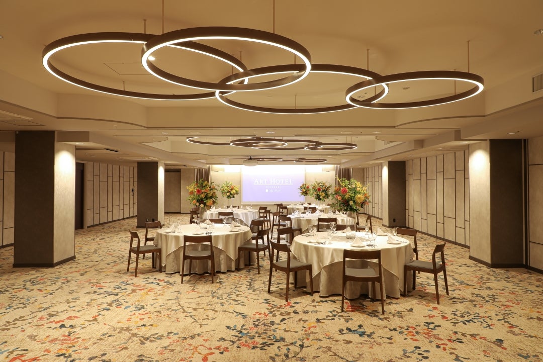 最大223名収容の大会場「日向」(ひなた)は、 人と人の出会いや広がっていく繋がりを宮崎のあたたかな風になびく枝葉で表現しました。 各種宴会、会議などのシーンに合わせ照明の調光調色が可能でございます。 可動式の仕切りを設けており、向日葵(ひまわり)最大収容96名、菜ノ花(なのか)最大収容42名、 立葵(たちあおい)最大収容72名の3会場に分割しご利用いただけます。
