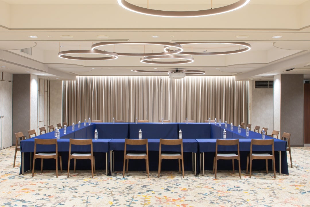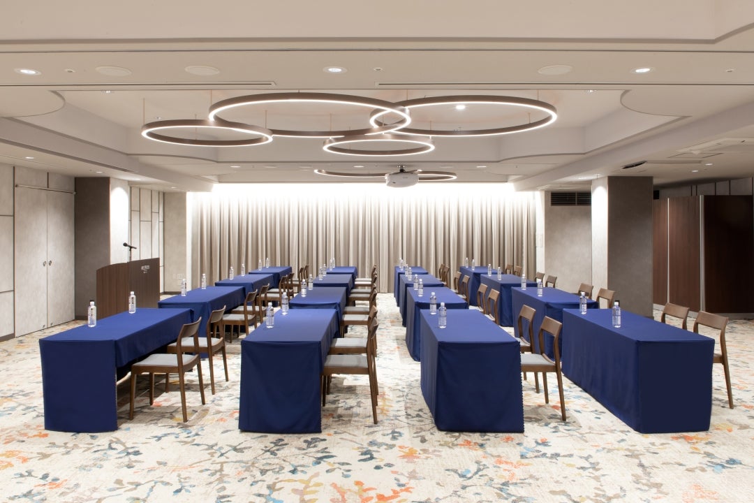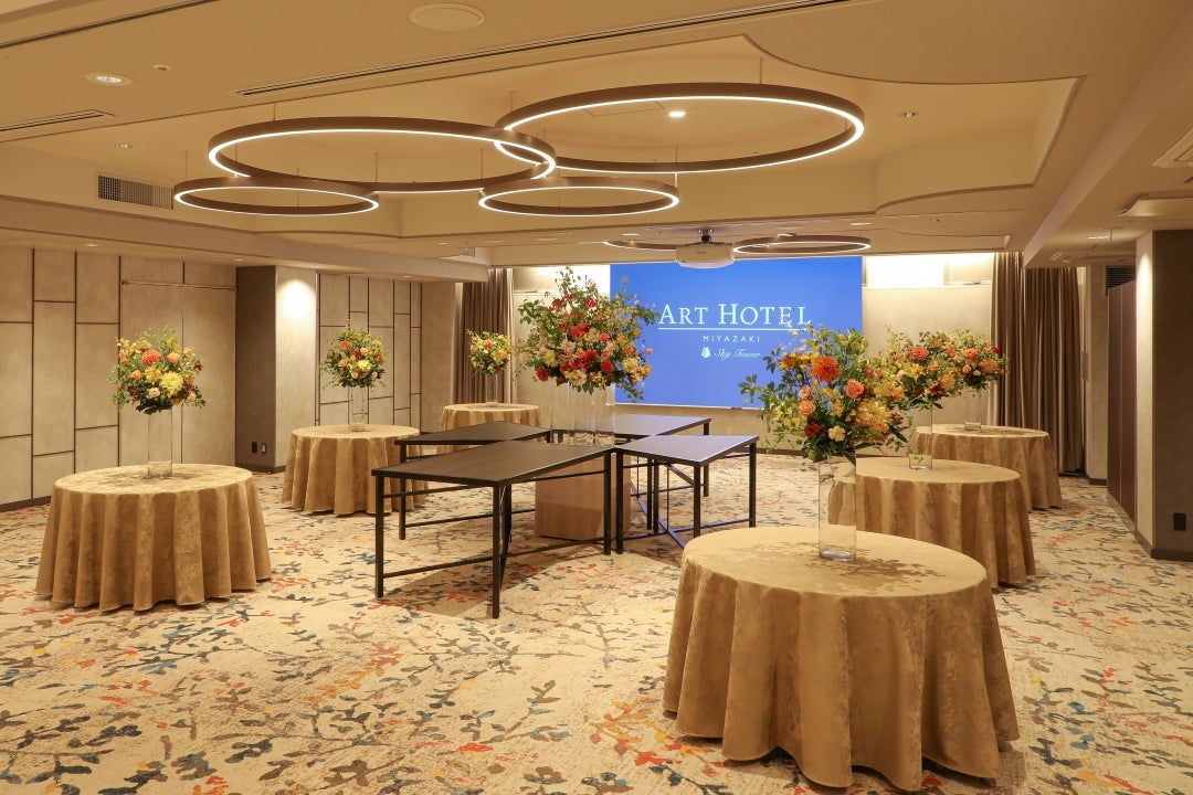 最大223名収容の大会場「日向」(ひなた)は、 人と人の出会いや広がっていく繋がりを宮崎のあたたかな風になびく枝葉で表現しました。 各種宴会、会議などのシーンに合わせ照明の調光調色が可能でございます。 可動式の仕切りを設けており、向日葵(ひまわり)最大収容96名、菜ノ花(なのか)最大収容42名、 立葵(たちあおい)最大収容72名の3会場に分割しご利用いただけます。