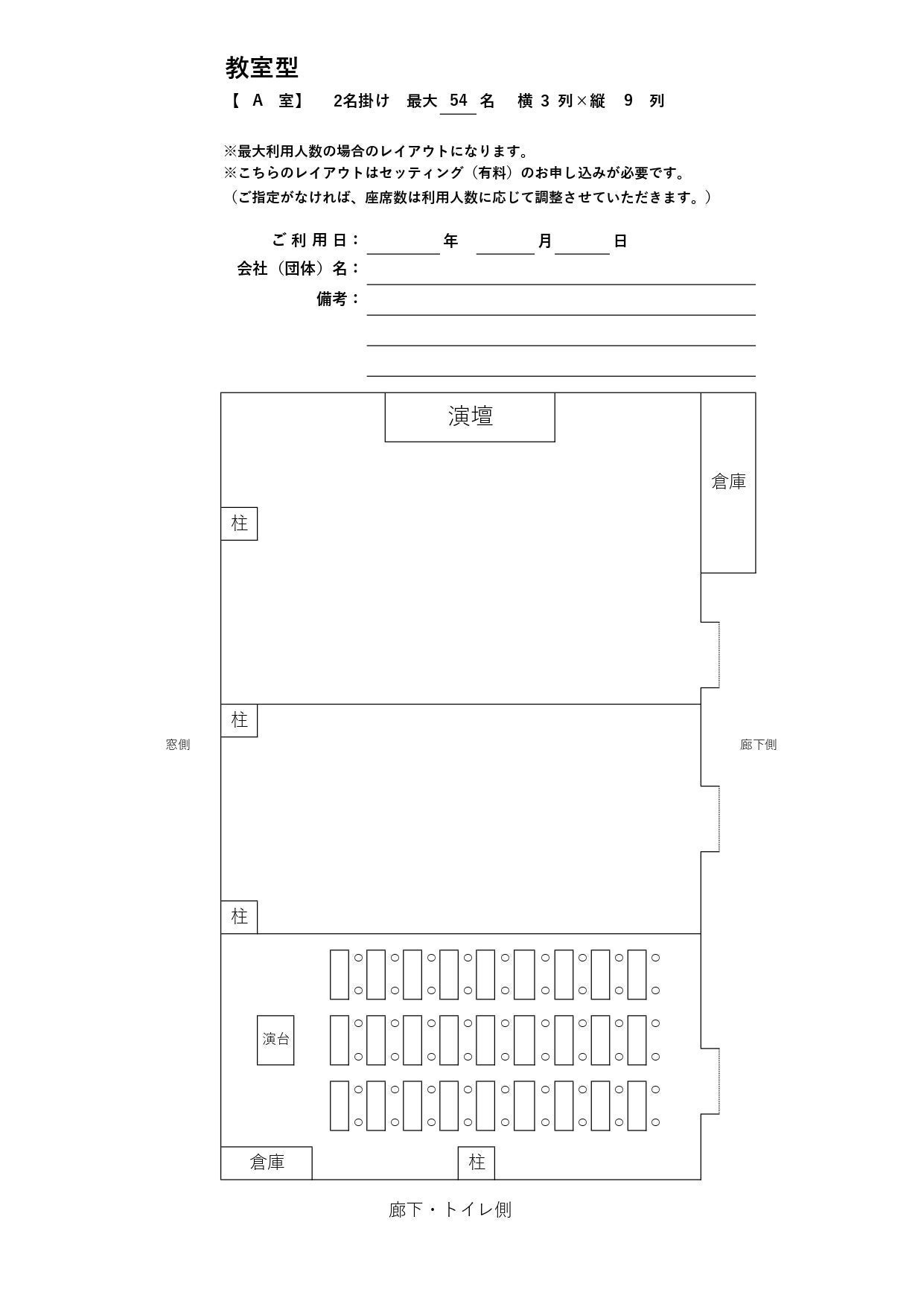 1.使用時間には準備及び後片付けの時間を含みます。必ず厳守してください。 2.机・イスのセッティングをご希望の場合は、ご予約の際に「セッティング(有料)」をお申込みください。 3.当日ご不明な点は、会議室内の内線(内線番号44・46・57)までお問い合わせください。 4.持ち込んだ荷物やゴミは、お持ち帰りください。 5.当ビルの敷地内および施設内はすべて禁煙ですので、喫煙はご遠慮ください。