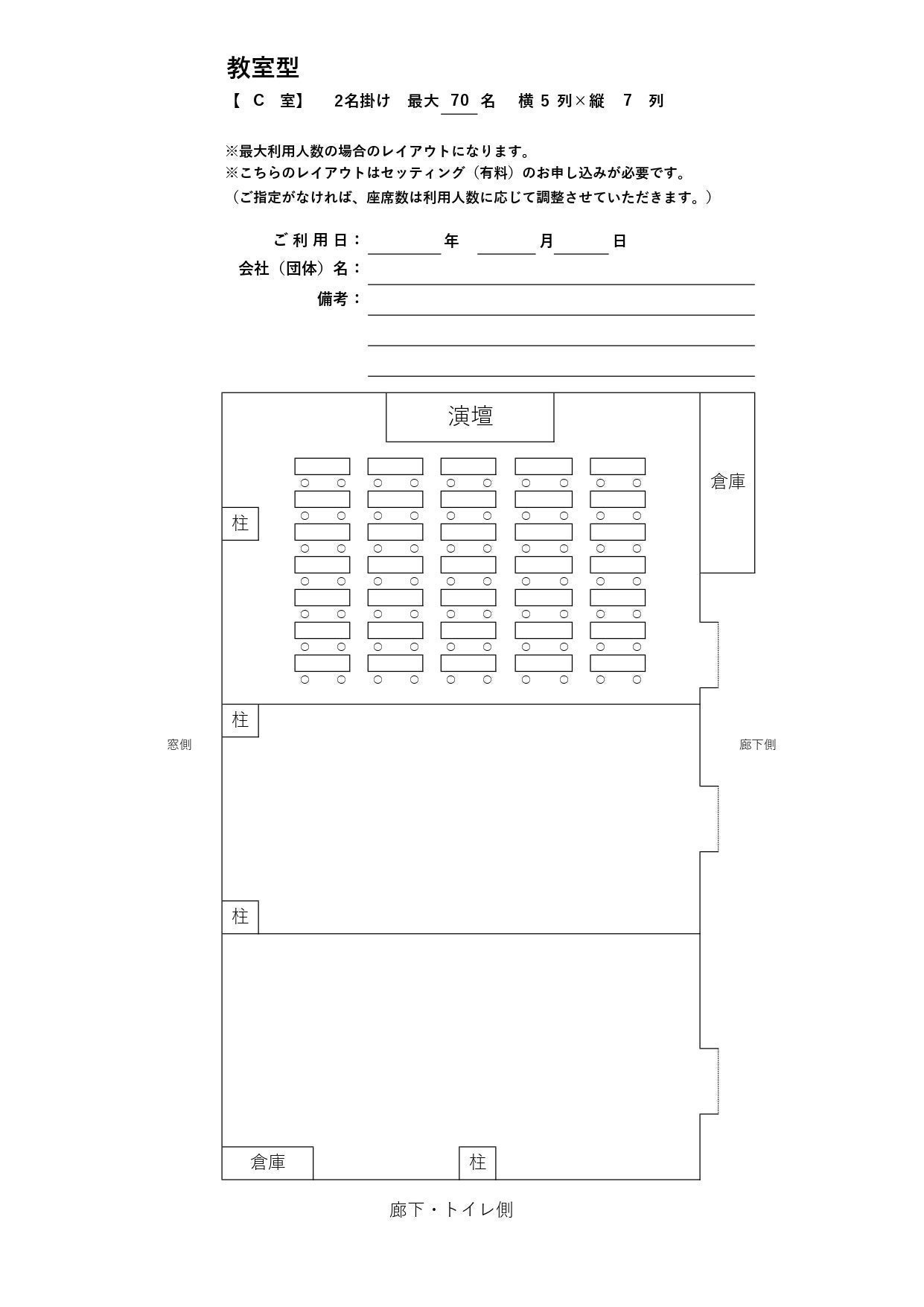 1.使用時間には準備及び後片付けの時間を含みます。必ず厳守してください。 2.机・イスのセッティングをご希望の場合は、ご予約の際に「セッティング(有料)」をお申込みください。 3.当日ご不明な点は、会議室内の内線(内線番号44・46・57)までお問い合わせください。 4.持ち込んだ荷物やゴミは、お持ち帰りください。 5.当ビルの敷地内および施設内はすべて禁煙ですので、喫煙はご遠慮ください。