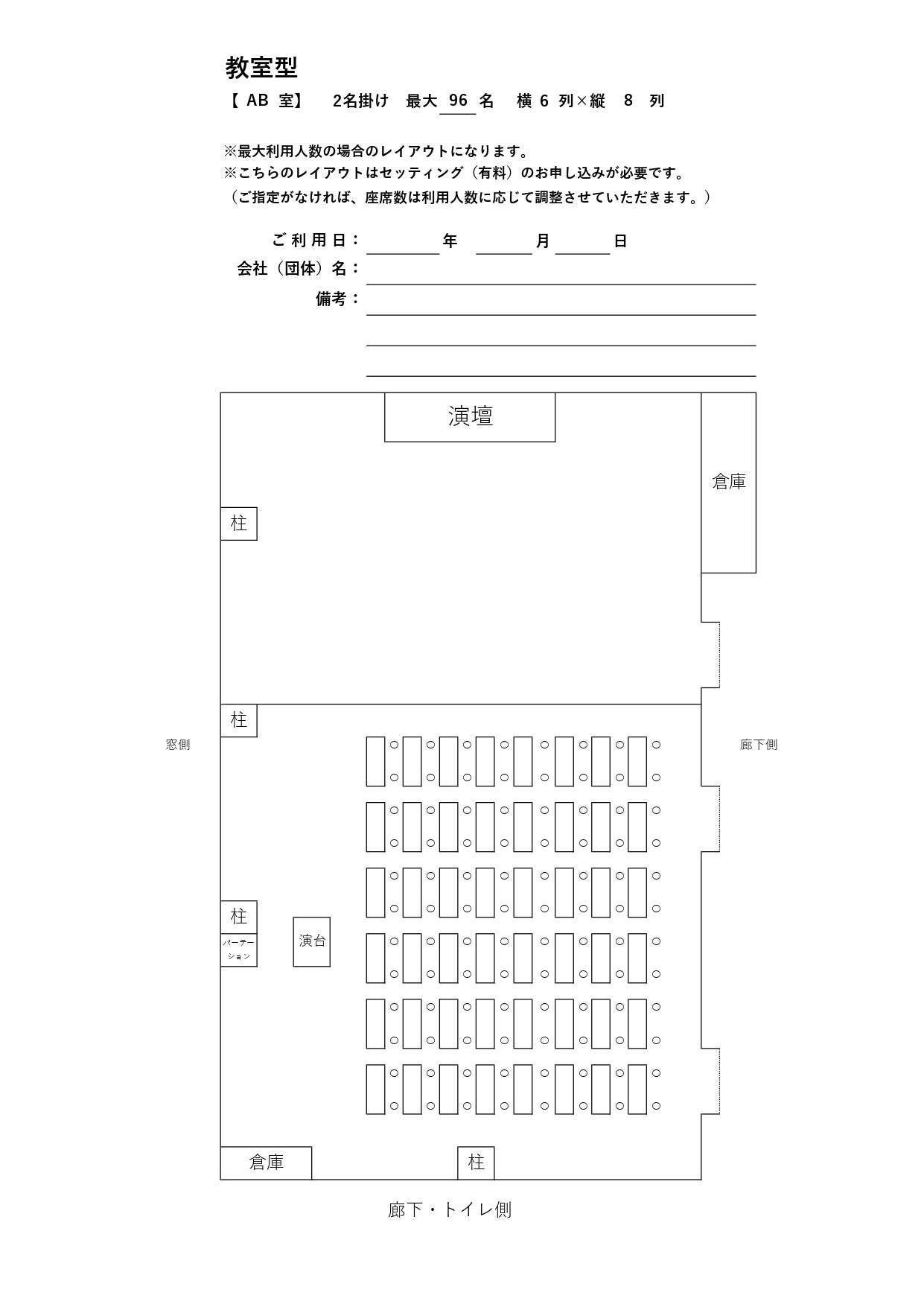 1.使用時間には準備及び後片付けの時間を含みます。必ず厳守してください。 2.机・イスのセッティングをご希望の場合は、ご予約の際に「セッティング(有料)」をお申込みください。 3.当日ご不明な点は、会議室内の内線(内線番号44・46・57)までお問い合わせください。 4.持ち込んだ荷物やゴミは、お持ち帰りください。 5.当ビルの敷地内および施設内はすべて禁煙ですので、喫煙はご遠慮ください。