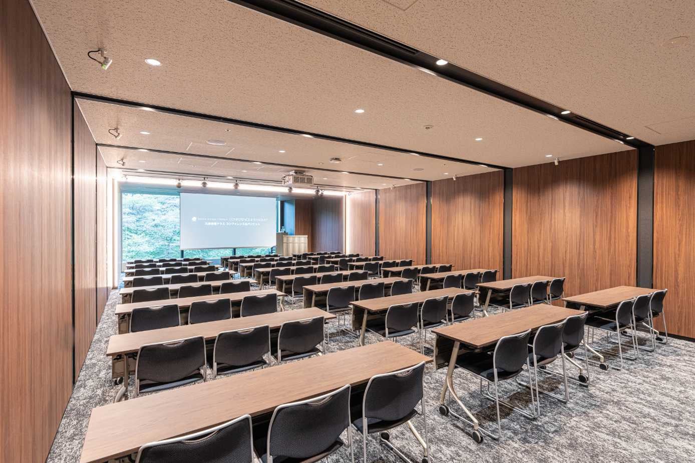 セミナーや会議、懇親会等、用途を選ばない快適な空間。 会場の奥まで目が届きやすい、お濠の景色を望める景観の良い115㎡の中規模会場です。 超高速ネット回線(NURO)を導入しておりますので、オンラインイベントでも安心してご利用いただけます。 ステージ・演台・司会台と音響機材一式が付帯、特徴的な間接照明がプレゼンテーションを印象付けます。