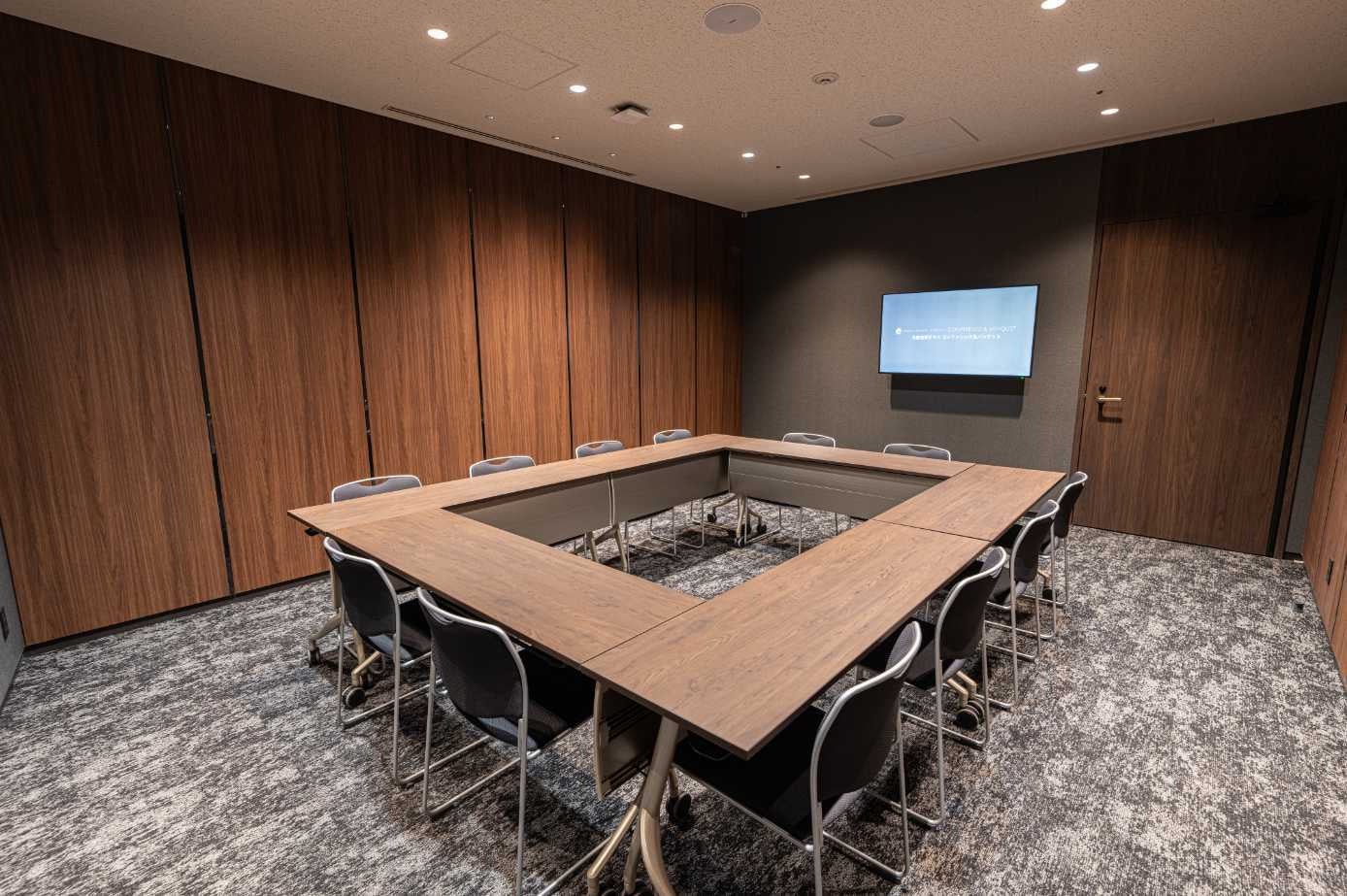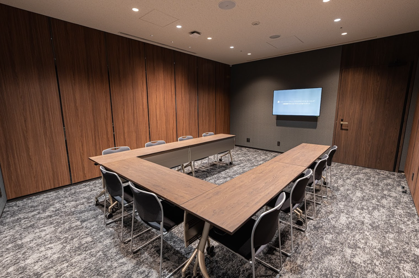 ロの字形式で最大12名収容可能です。 無料の55インチの壁掛けモニタ―が設置されており、他会場と併用した控室にも最適です。 55インチ液晶モニターとスピーカーへメイン会場からの映像・音声伝送が可能です。 マイク無しでも声が届くサイズ感で、社内会議などにもおすすめです。