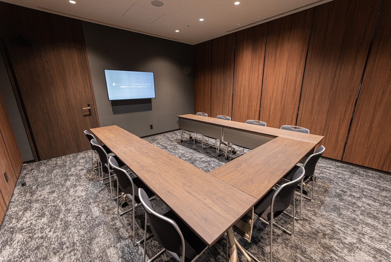 ロの字形式で最大12名収容可能。 隣接する「304-菫」と同タイプの使いやすい小部屋です。 遮音性も高く、小規模な会議や商談、採用面接などにも最適です。 壁掛けの55インチモニターは無料でご利用いただけます。 3階同フロアの会議室と併せてご活用ください。