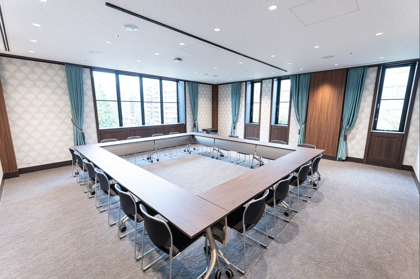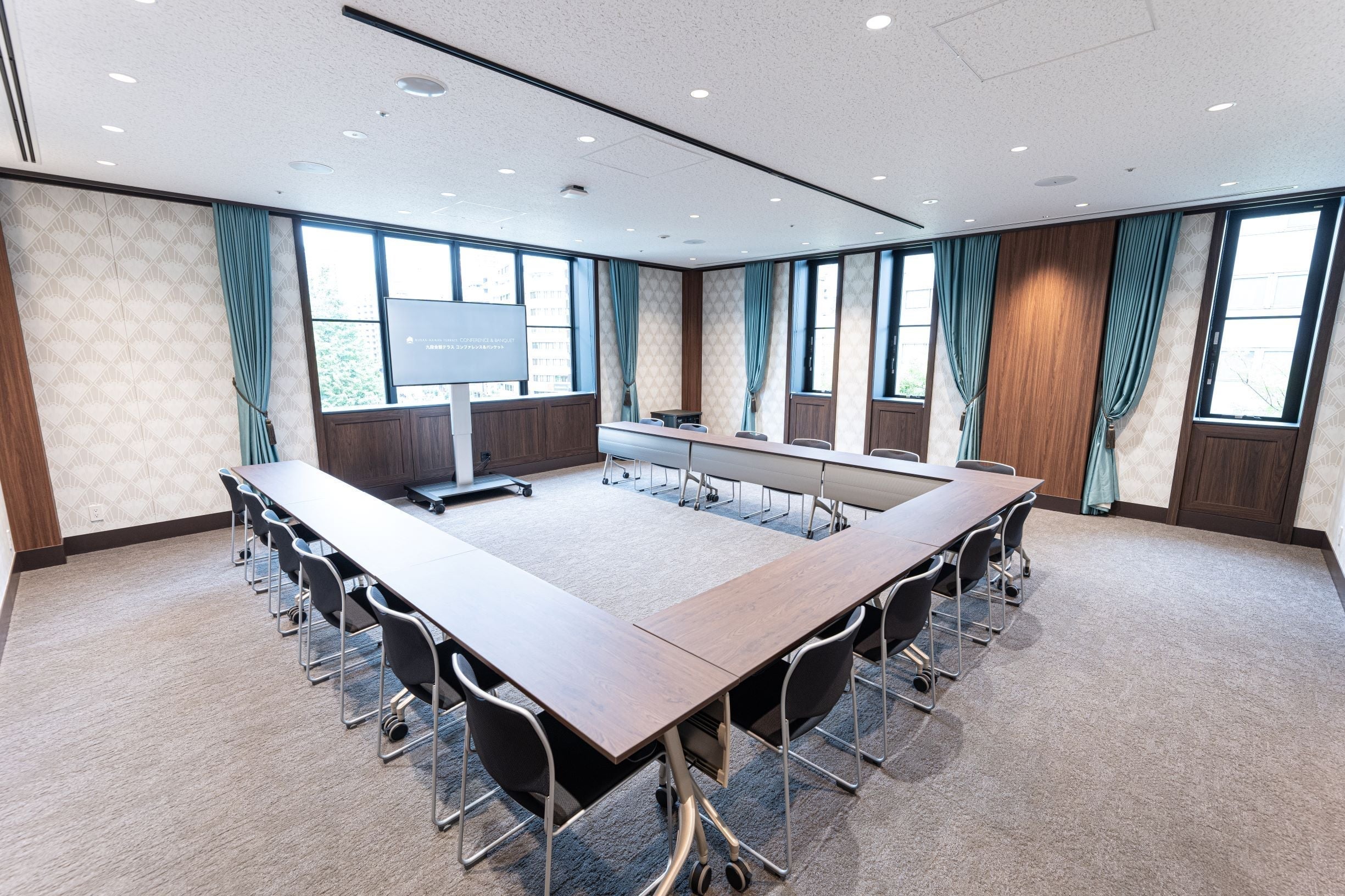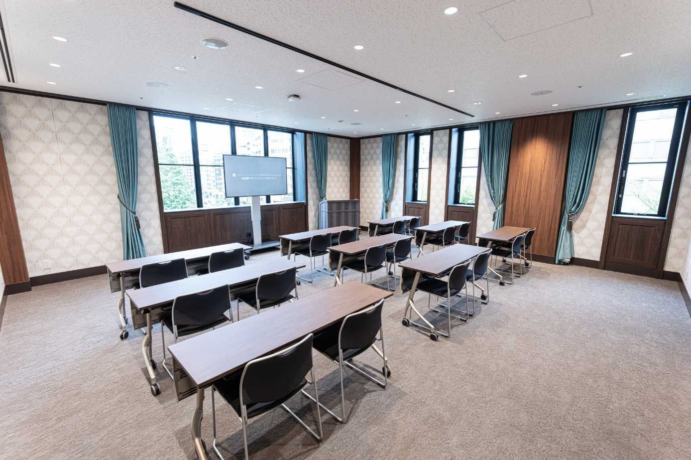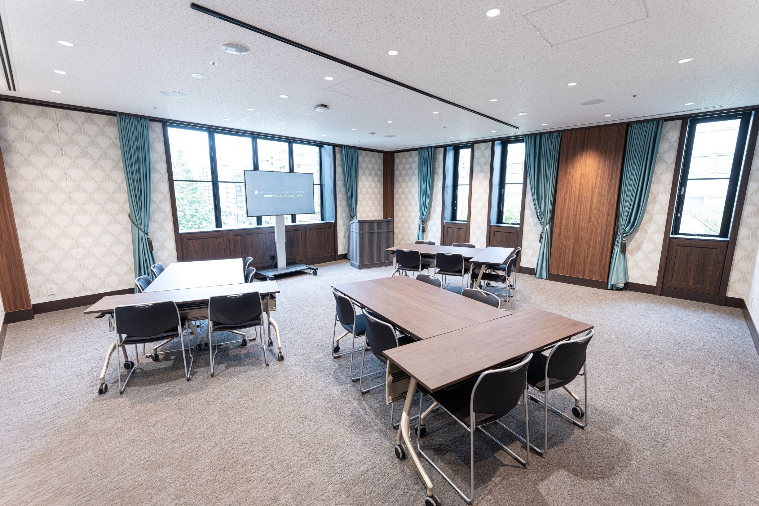 2面採光による明るく開放感のある大きな窓が特徴的な会議室。 レトロモダンなデザインの落ち着きのある空間。 演台や受付台、マイク、インターネット共有回線が無料で付帯しております。 65インチモニター(有料)を活用した20名規模のコンパクトなセミナーやWEB会議にも最適。 落ち着いた雰囲気の会議室のため、懇親会や少人数の会食などでもご利用いただけます。