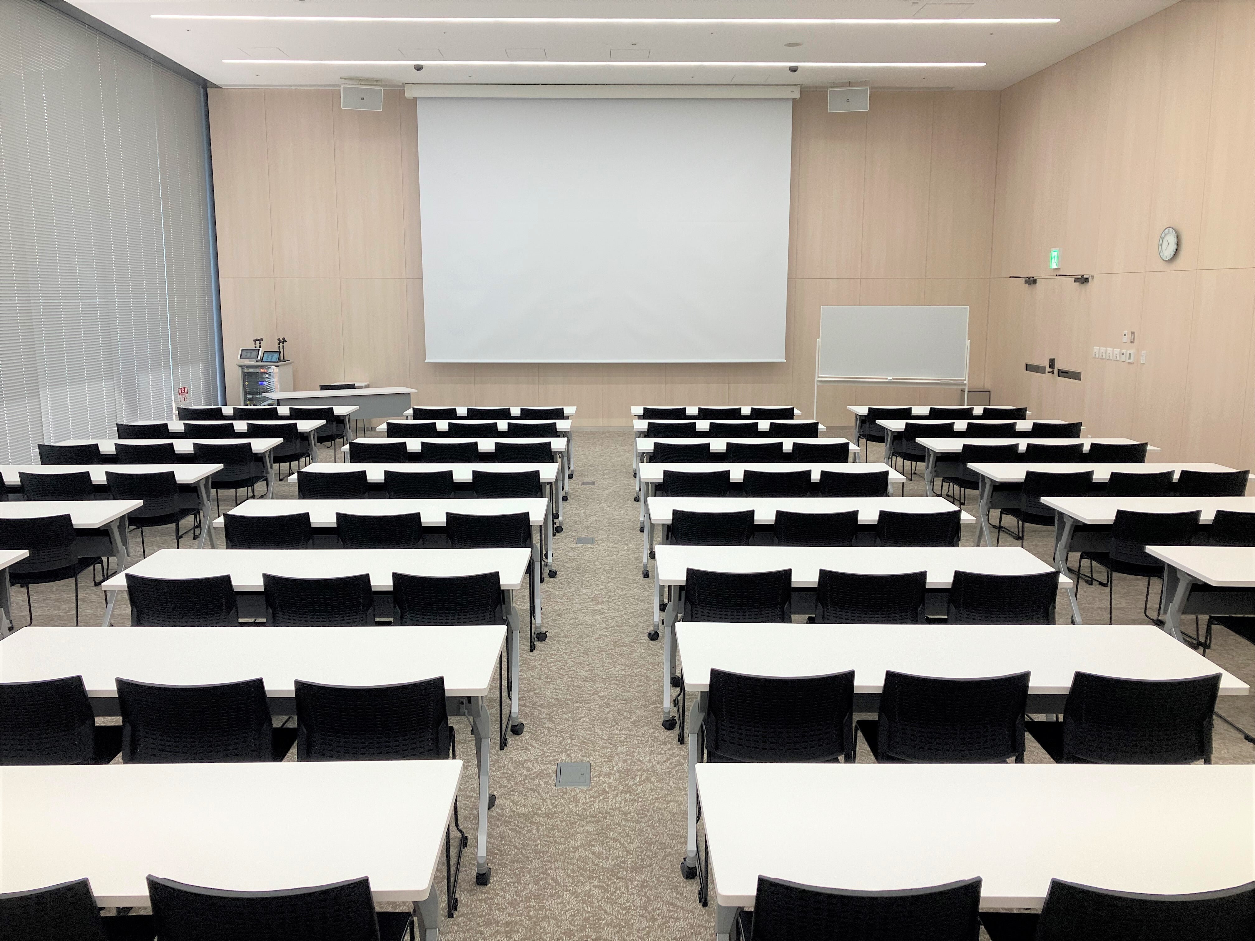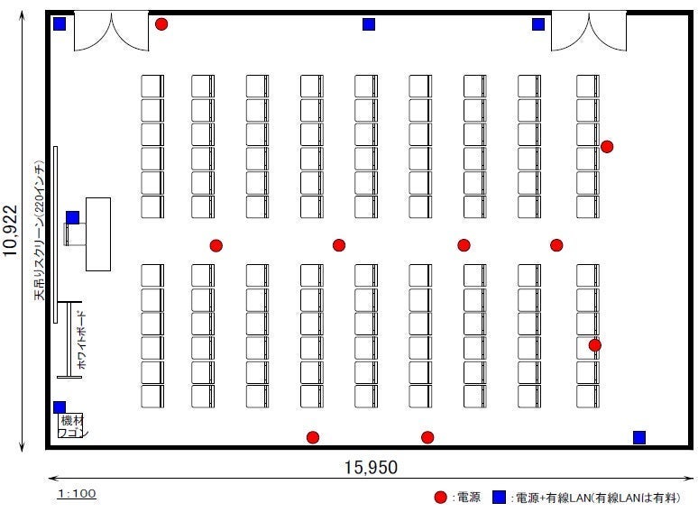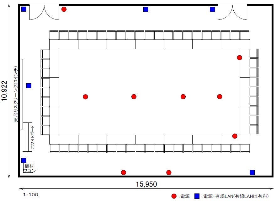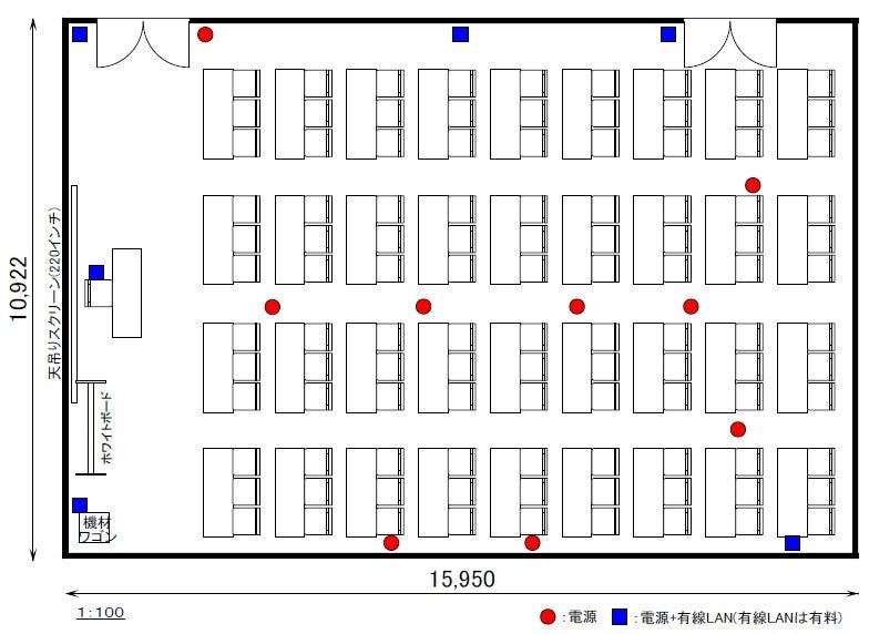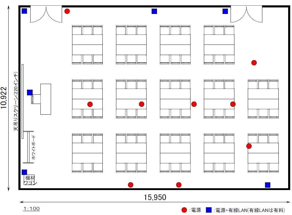 ※スマートロックにより扉の開錠・施錠を行います。 ※天吊りスクリーン220インチ、ホワイトボード1台が備え付けとなっております。 ※有線(有料)・無線共にインターネットがご使用いただけます。 通信速度に関しては、回線の混雑状況により繋がらない事や速度低下が発生することがあります。 ※6:00~21:00の間は館内へ荷物を搬出入いただくことはできません。(詳細はホームページをご覧ください)