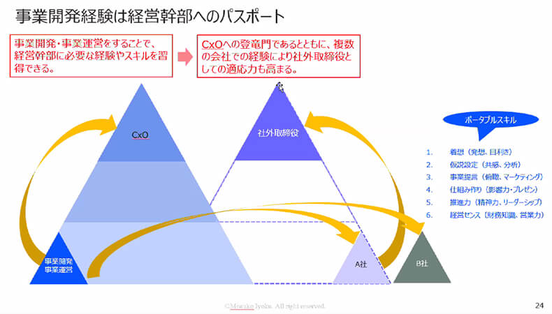 事業開発・事業運営をすることで、経営幹部に必要な経験やスキルを習得できます。CxO(Chief x Officer)への登竜門であるとともに、複数の企業経験により、自社・他社、自業界・他業界どちらの知見も貯まっていくため、社外取締役としての適応力も高まっていきます。イントレプレナーとして得たスキルは、どの組織、どの分野に行っても活用できるポータブルスキルなので、ぜひパラレルキャリアで発揮してほしいとエールを送りました。人材不足が叫ばれる中、1つの会社のためだけに滅私奉公する時代は終わり、これからはルールを守りながら複数の企業で活躍する「ひとりオープンイノベーション」の時代だと伊能氏は言います。社内で上下に動くだけではなく、会社を飛び出し、横に視野を広げてパラレルに動いていくことを推奨されました。